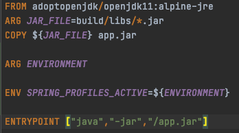 Dockerfile에서 선언해놓은 ENVIRONMENT로 dev값을 주고 docker run을 하게되면 위에서 설정해놓은 application-dev.yml 파일의 설정으로 동작하게되고 만약 ENVIRONMENT의 값을 prd로 주면 application-prd.yml 파일의 설정으로 동작하게 됩니다.