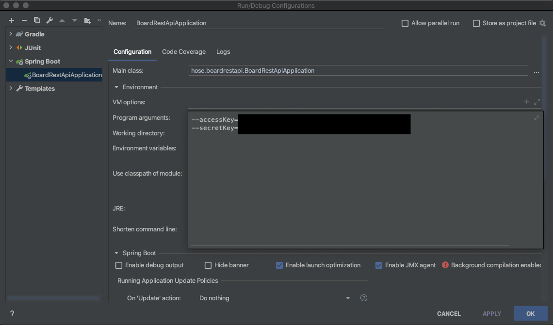 accessKey와 secretKey에 ${} 이렇게 되어있는데 노출을 피하고자 외부에서 주입하는 것입니다.