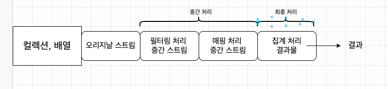 스트림은 컬렉션의 요소에 대해 중간 처리와 최종 처리를 수행할 수 있는데, 중간 처리에서는 매핑, 필터링, 정렬을 수행하고 최종 처리에서는 반복, 카운팅, 평균, 총합 등의 집계 처리를 수행한다.