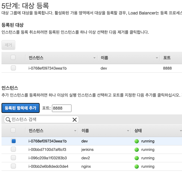 이제 방금 만든 그룹에 속할 인스턴스를 등록해야 하는데요 저는 dev 인스턴스 하나만 넣도록 하겠습니다. 그후 다음을 눌러주면 검토화면이 나오는데 확인 후 생성을 눌러줍니다.
