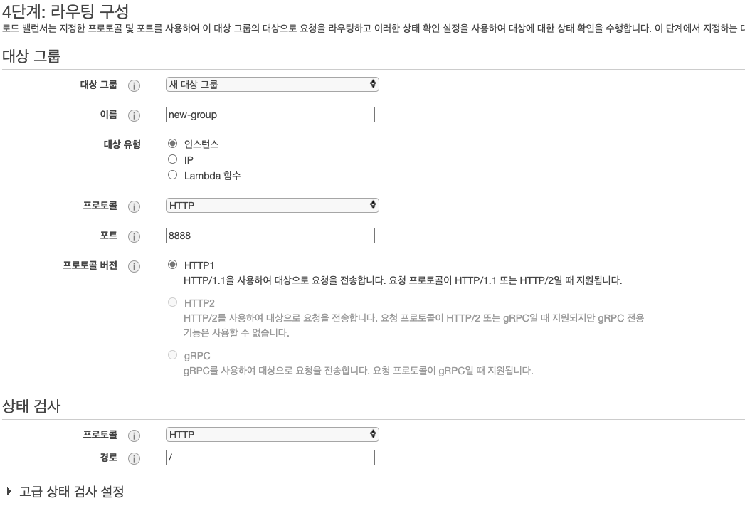 이제 이 로드밸런서를 이용하여 라우팅할 그룹을 설정해야 하는데요 저의 경우 그룹이 없어서 새로 만드는 작업도 같이 하겠습니다. 중간에 프로토콜과 포트가 있는데 저는 EC2 인스턴스에서 HTTP 프로토콜과 8888번 포트를 사용하여 Application을 실행하고 있기 때문에 맞춰주었습니다. 그후 다음을 눌러줍니다.