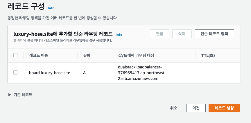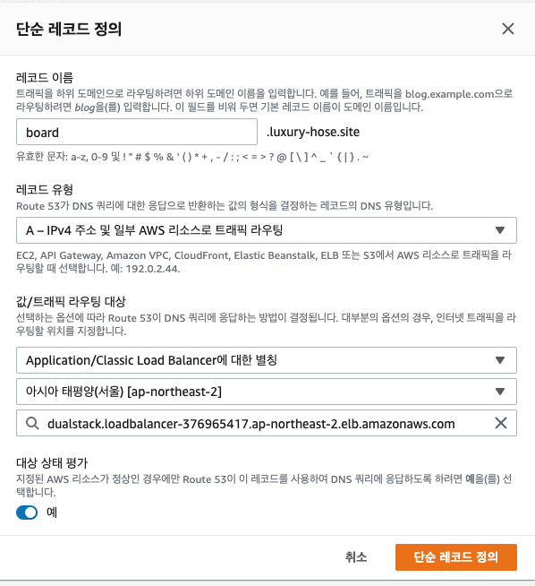 그 다음 방금 만든 load balance를 연결시켜줍니다. 그 다음 단순 레코드 정의를 눌러줍니다.