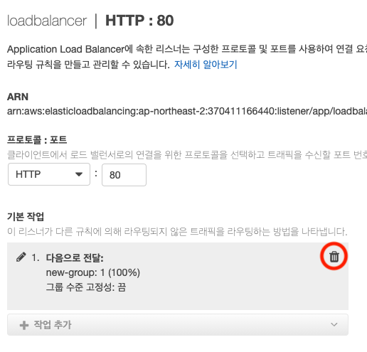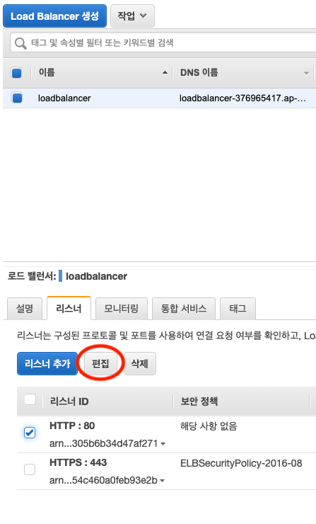 이제 80번 포트로 들어오는 연결을 443 HTTPS로 리다이렉트 시켜보겠습니다. 로드밸런서 메뉴로 들어오신후 80번 포트 리스너를 선택 후 편집을 눌러줍니다.