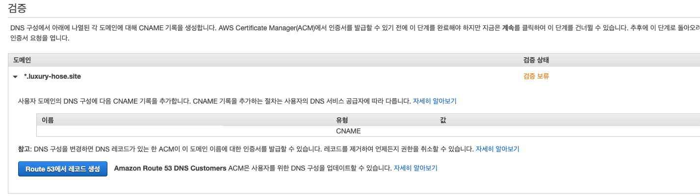 그러면 이런화면이 나올텐데 Route 53에서 레코드 생성을 눌러줍니다. 그러면 자동으로 생성이됩니다. 그런다음 계속을 눌러준 후 검증이 될때까지 대기해 줍니다.