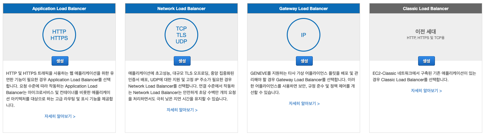 AWS 메뉴에서 EC2 메뉴로 들어가신 뒤 왼쪽 사이드메뉴에서 로드밸런서를 눌러 줍니다. 그런다음 Load Balancer 생성을 눌러 줍니다.