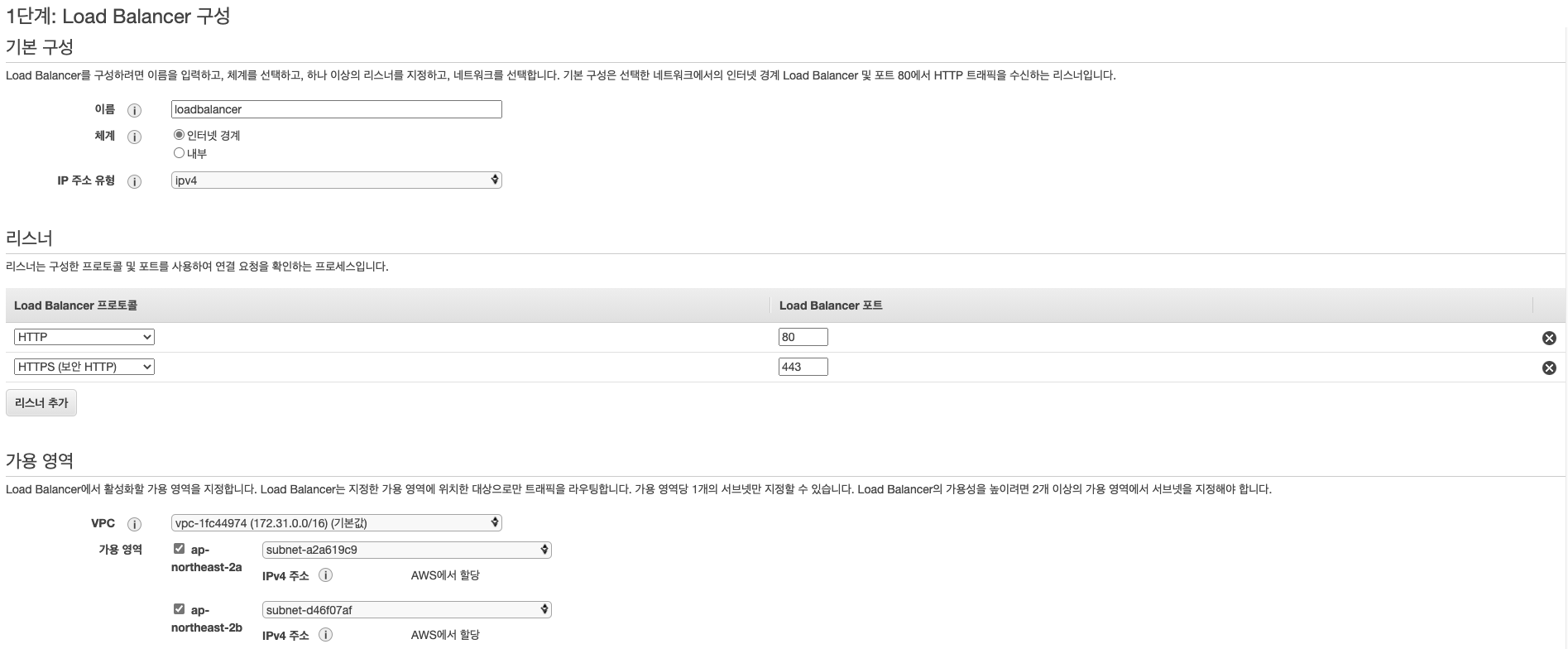 사용 하실 로드밸런서 이름과 80번 포트와 443 포트를 모두 열어줍니다. 80을 포트를 열어주는 이유는 나중에 80번 포트로 접속시 자동으로 443 포트로 리다이렉트 시키기 위함입니다. 다음을 눌러줍니다.