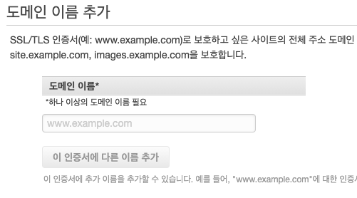 아래에 본인의 도메인을 적어줍니다. ex) *.example.com으로 적어두시면 example.com의 하위 도메인까지 모두 포함합니다. 입력 후 다음을 눌러줍니다.
