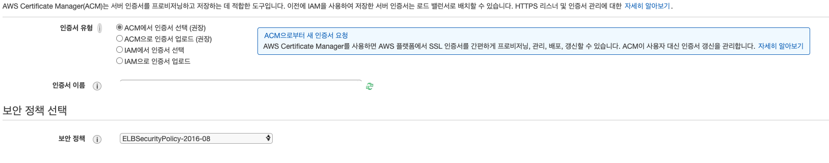사용 하실 로드밸런서 이름과 80번 포트와 443 포트를 모두 열어줍니다. 80을 포트를 열어주는 이유는 나중에 80번 포트로 접속시 자동으로 443 포트로 리다이렉트 시키기 위함입니다. 다음을 눌러줍니다.