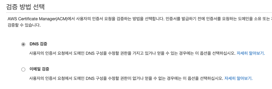 검증 방법은 DNS검증을 하겠습니다. 다음을 눌러 줍니다.